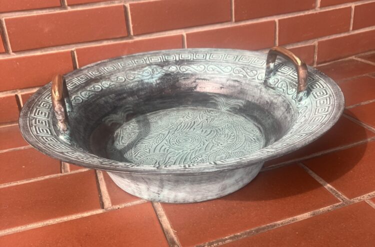 中国古来より伝わる器具・魚洗鍋を体験展示!水を張った鍋の取っ手をこすると低い音とともに水しぶきが上がるよ。