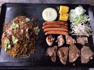 牛肉100g、豚肉80g、ワニ肉串2本、野菜4種、やきそば