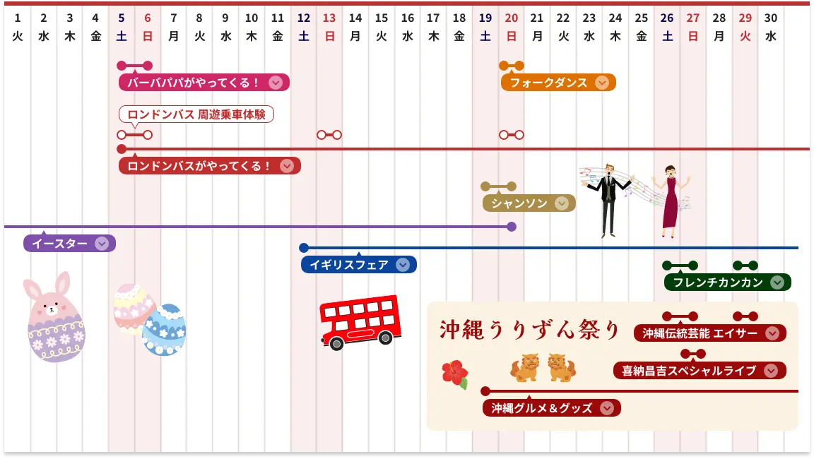 - 3月29日(土)~4月6日(日)、4月12日(土)、13日(日)、19日(土)、20日(日)