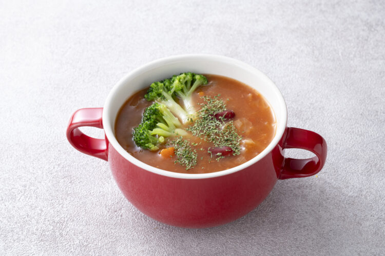 トマトの爽やかな酸味と野菜の甘みがたっぷり詰まった優しいスープ。