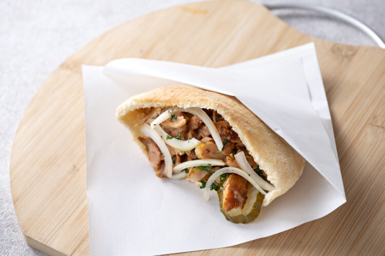 ピタパンにチキンのお肉と野菜をサンドにしました。