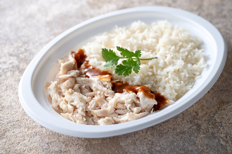 味付きごはんと鶏肉の相性抜群♪ソースはピリ辛ですが、辛いのが苦手な方はスタッフまで♪