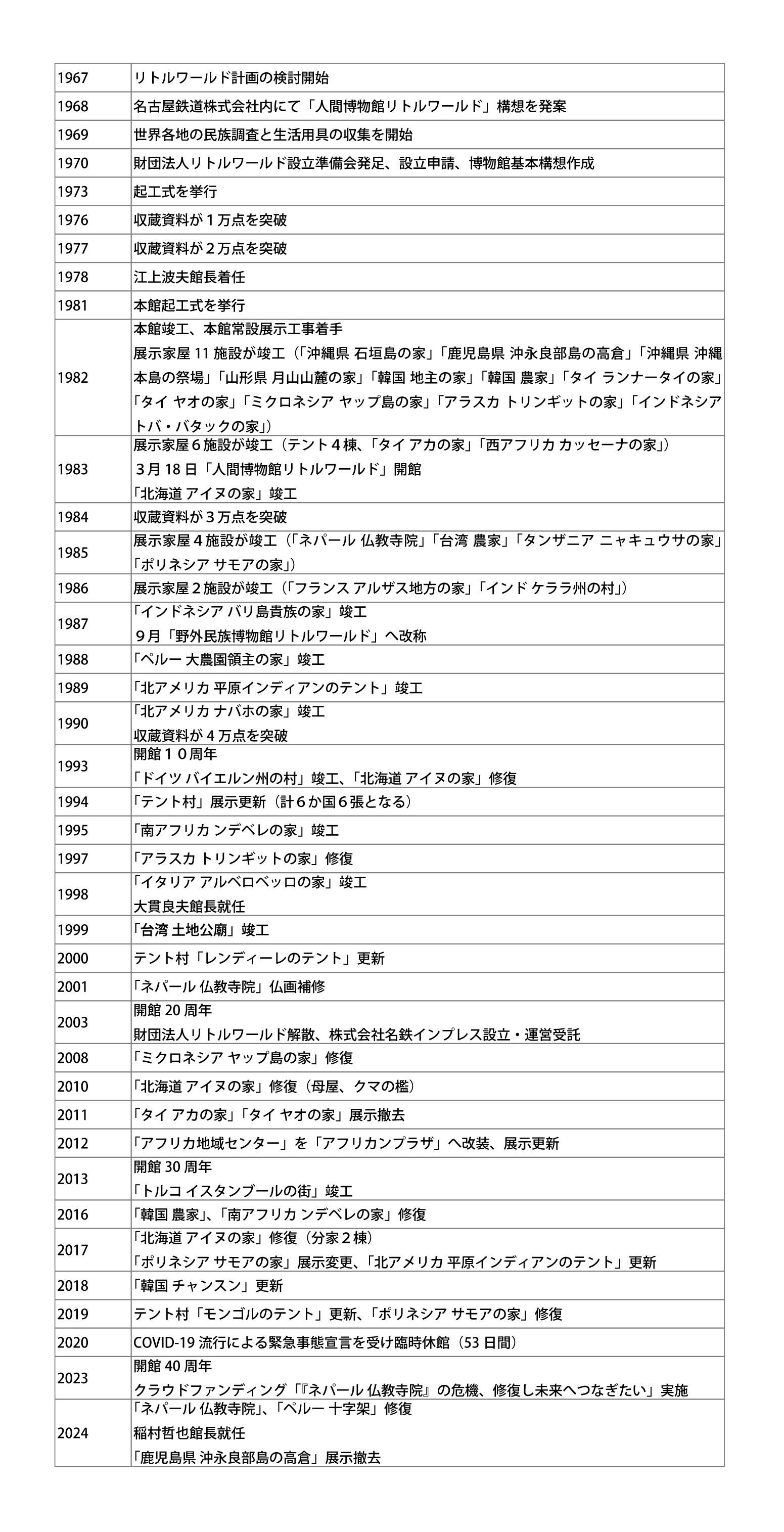 リトルワールドは15年余の準備期間を経て、1983年3月に開館しました。開館後も新しい展示家屋を建設しています。ここでは構想段階から現在までの主な活動の沿革を掲載しています。