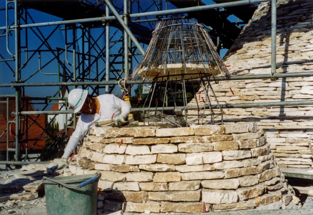 屋根は薄く平らな石を積み上げてつくります。トゥルッリ造りでは、元来モルタルのような接着剤を使いません。石をただ積み上げ、その摩擦と重みだけで天井を支える、から石積みが伝統的工法です。現在でも、できるだけモルタルを使わずに積むことが、職人の腕の見せ所です。