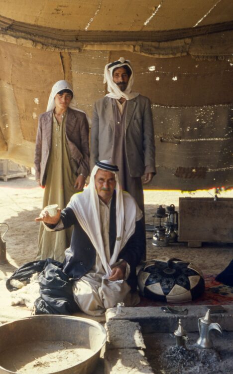 男の間の中央には、来客をもてなすためのコーヒー用の炉が設けられています。炉端の小型ポットでは、常に温かいコーヒーが用意されます。ベドウィンにとってコーヒーは、日本の茶道にも匹敵する作法を伴う、特別な飲み物です。