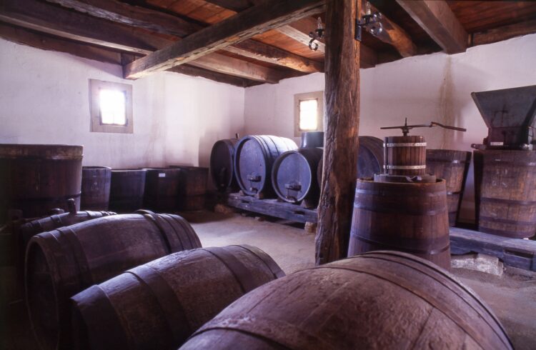 母屋の1階にはワイン貯蔵室があり、ここはワインの品質を保つために、環境があまり変化しない半地下式の構造をしています。内部にはしぼり機や発酵用の樽などのワイン作りの道具が展示されています。