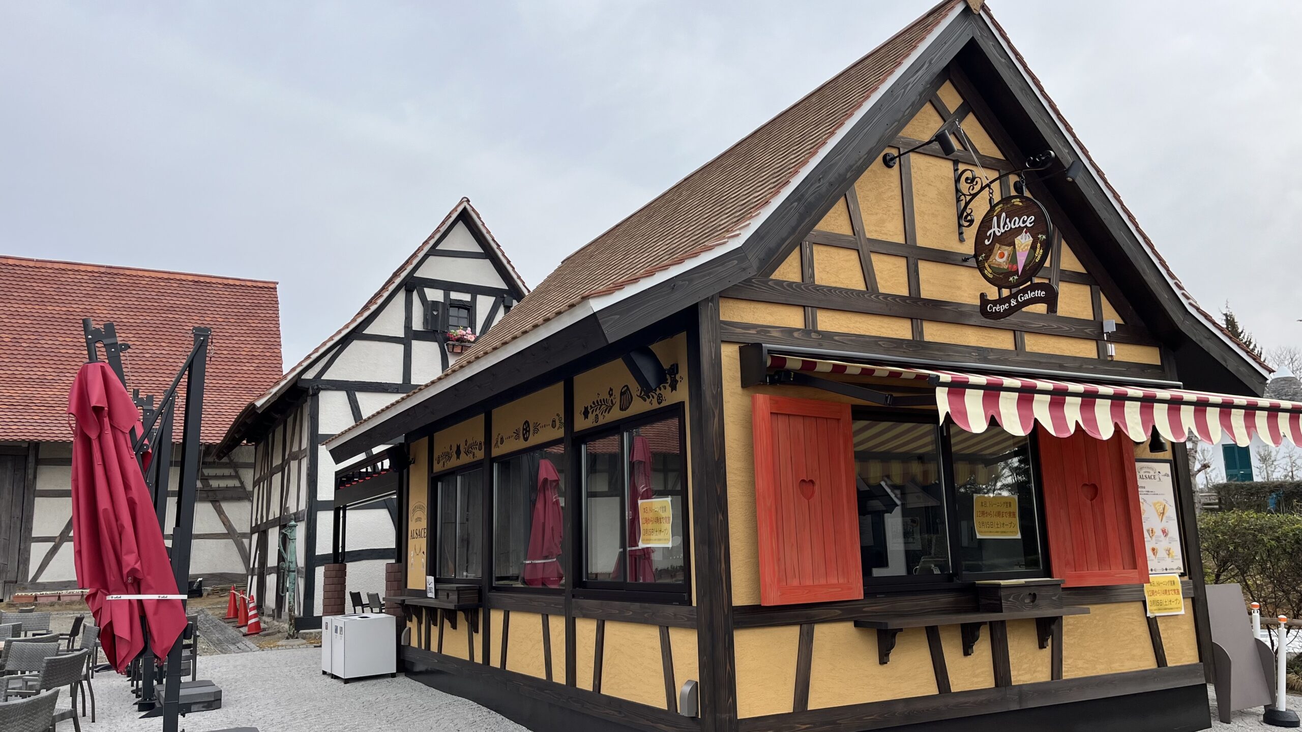 屋根は積雪を防ぐため急勾配になっています。白いしっくいの壁に柱や筋交いなどが浮き出ていて、“コロンバージュ”と呼ばれる中部ヨーロッパ独特の木骨構造で建てられています。