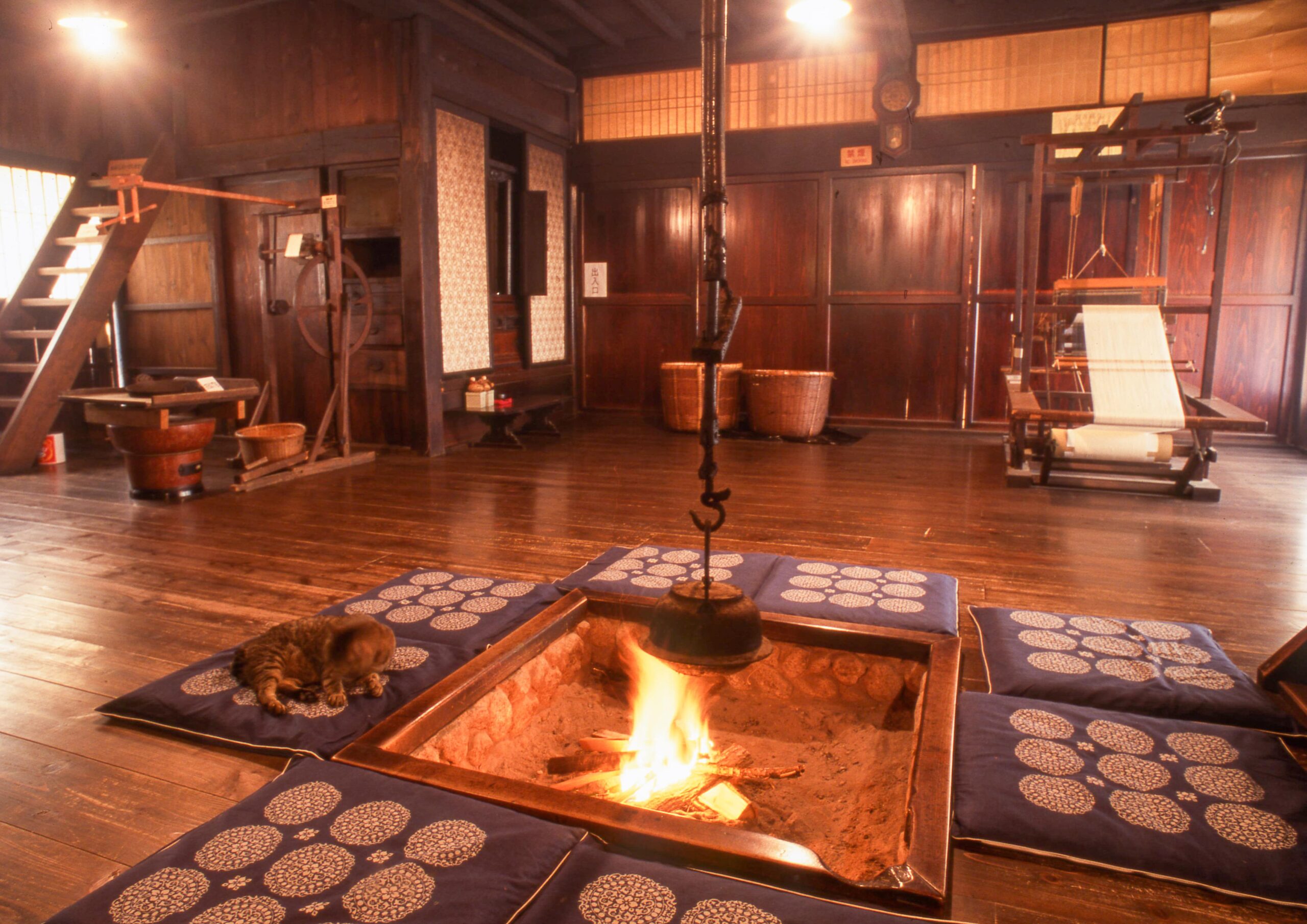 調理、暖房、団らんの場としてたいせつにされた座敷のいろり。主人は上手のヨコザ、主婦は台所側のカカザ、客は縁側に近いキャクザと席順が決められ、土間側は薪を燃やす場所・キジリとなっていました。また、いろりの枠を踏んではいけない、四足動物を料理しない、爪や髪を燃やさないなど、いろりを巡るしきたりもさまざまにありました。火種は年中絶やさないようにして、新年に新しく火をおこすならわしでした。