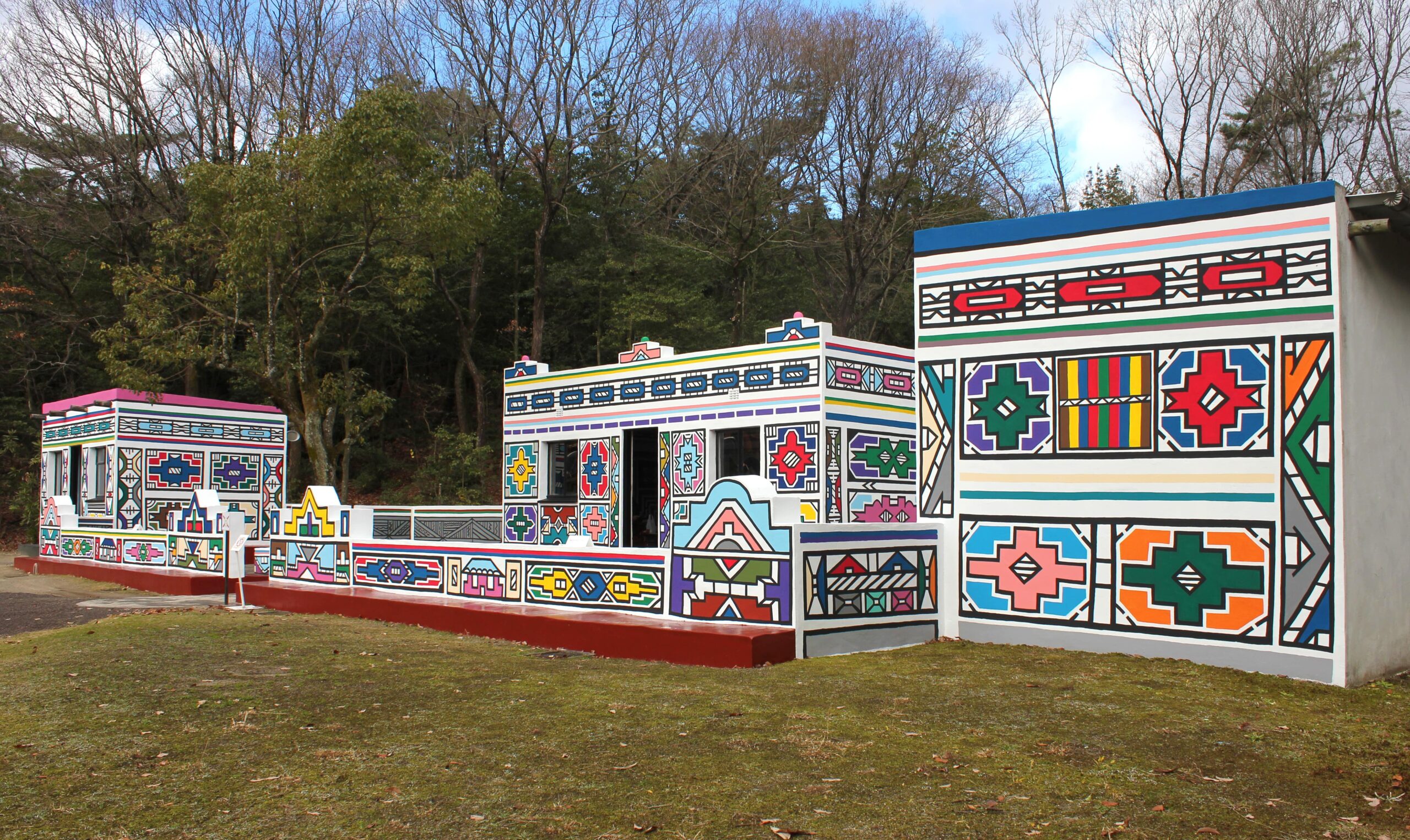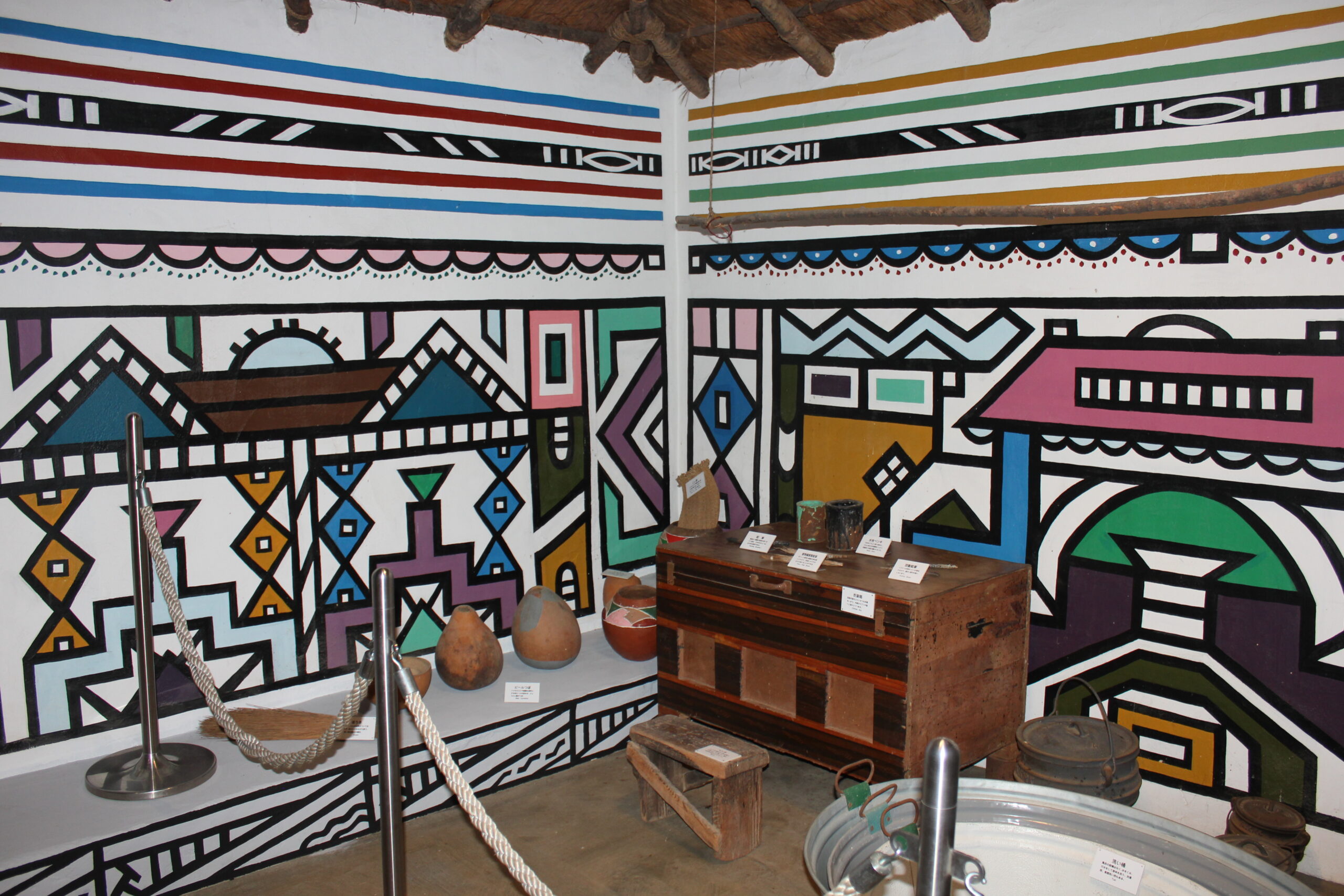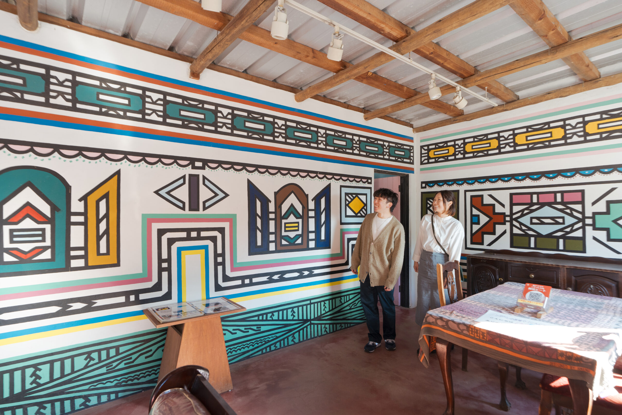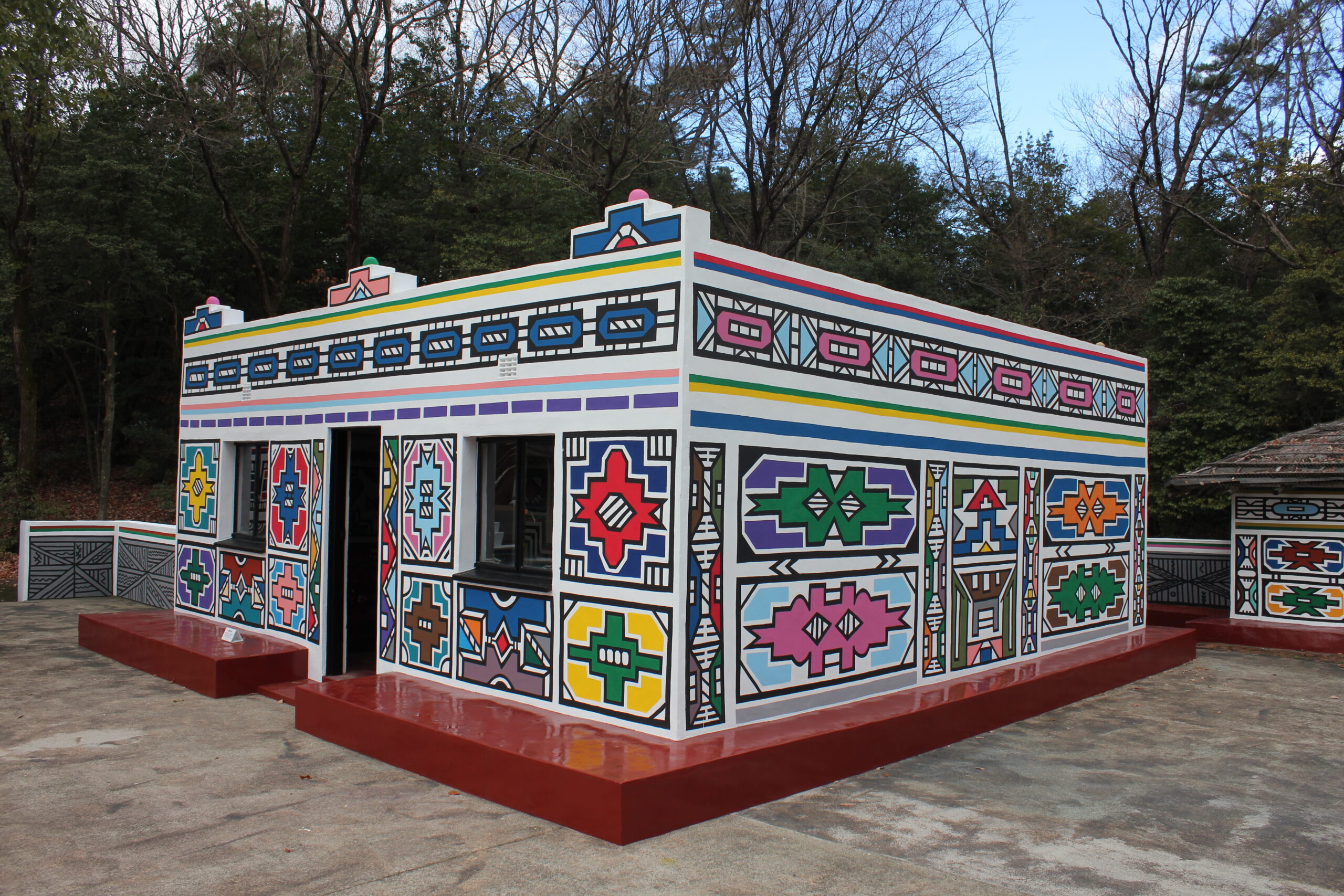 展示家屋では、そんな近代化、西欧化の波の中で、自らの伝統をうまく調和させて生きるンデベレの現代のくらしを再現しています。その大きな特徴は独特の色彩感覚で、家屋の壁には精密でカラフルな幾何学模様が描かれています。