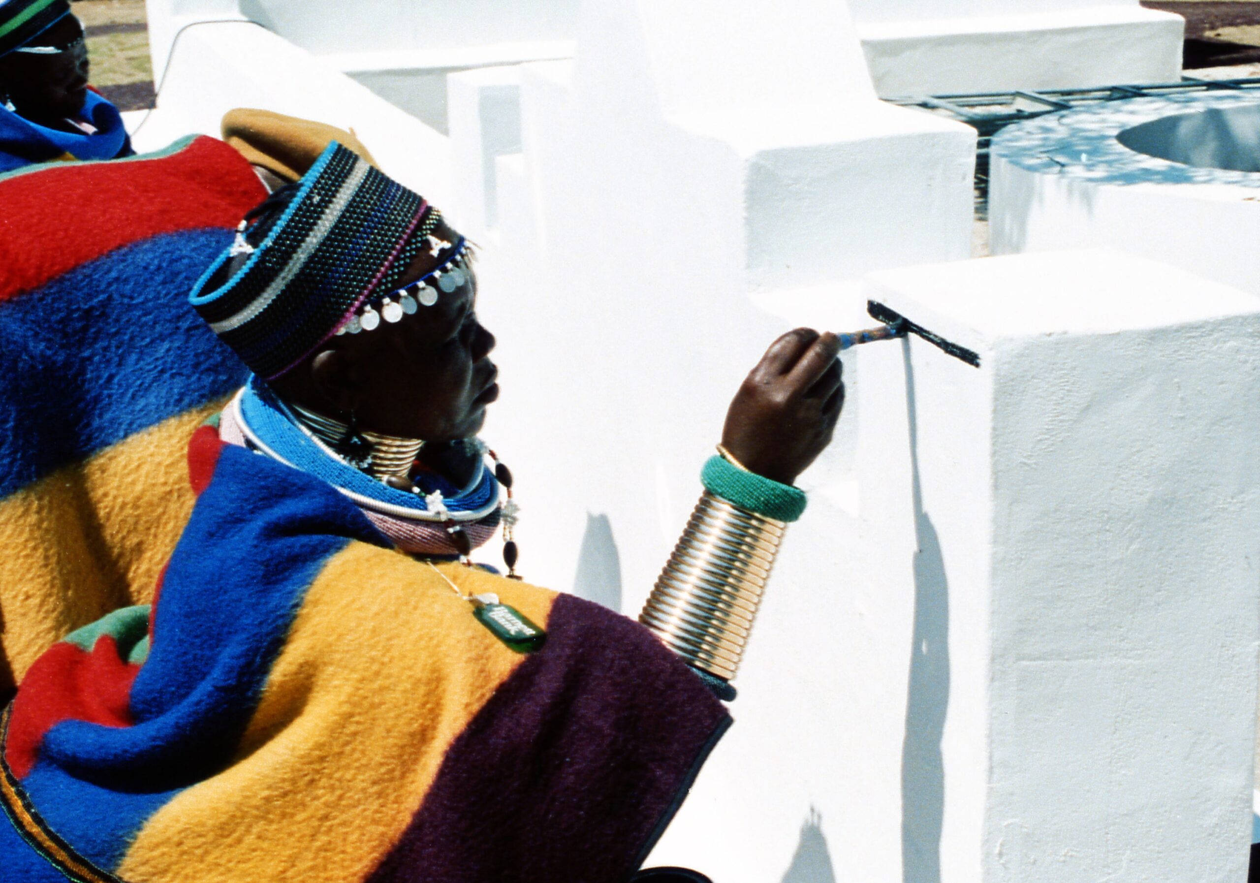 性別、世代に応じて身に着けるべき衣装が決まっています。女性はガラス製のビーズ細工の装飾品、アクリル製のカラフルな毛布をまとう一方、男性は皮を主体にしたものを身につけます。こうした民族衣装は、近隣の他の民族には見られないンデベレ独自の文化です。