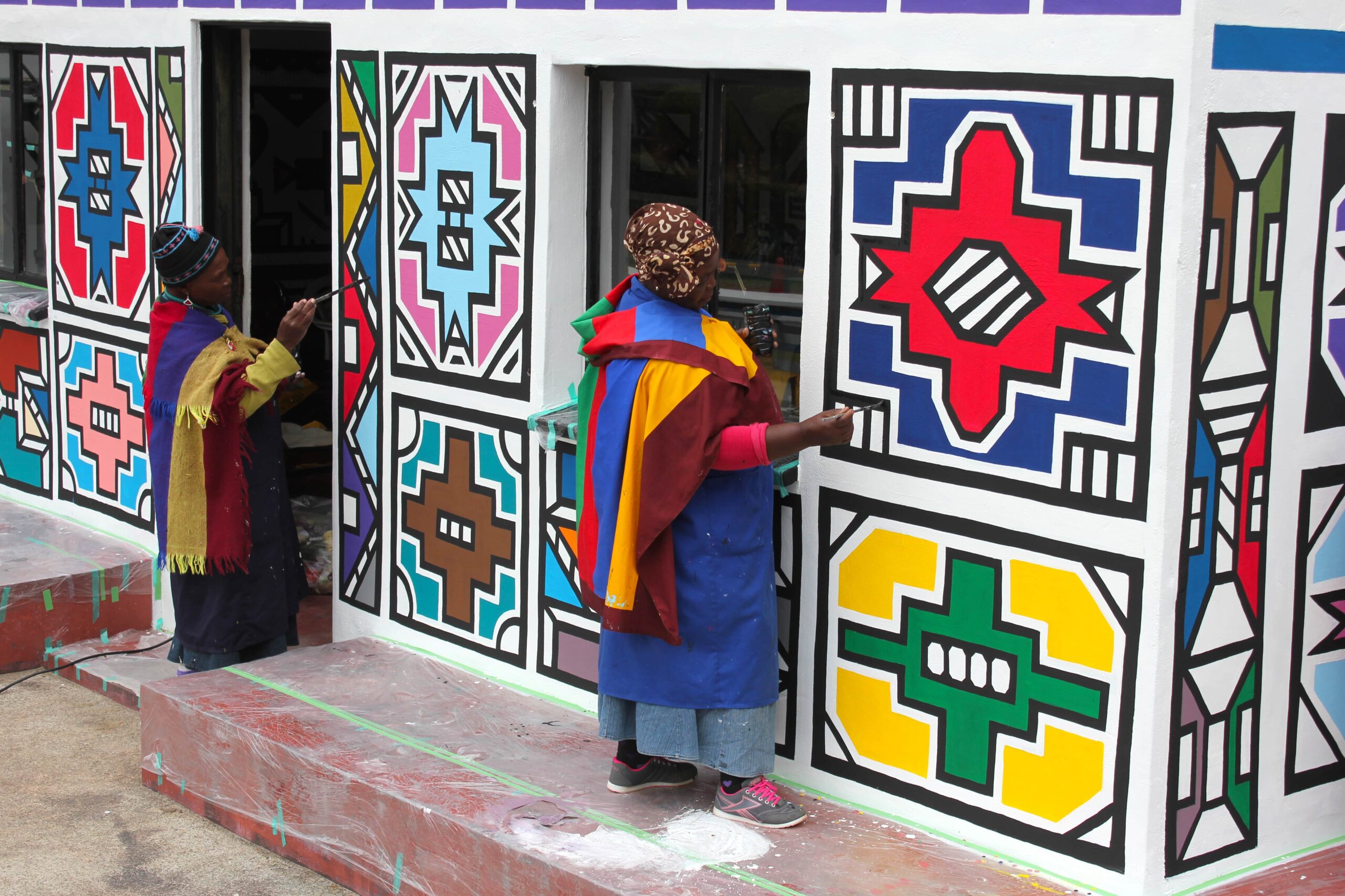 1995年にこの家屋を復元した際、壁絵は現地から招聘した4人の絵師によって、約2か月をかけて描かれました。それから約20年が経過し、紫外線や風雨により外壁面の色褪せが進み、劣化が目立つようになりました。そこで2016年9月に、南アフリカから4名の絵師を招き、約2か月をかけて壁画の塗り直し作業を行いました。