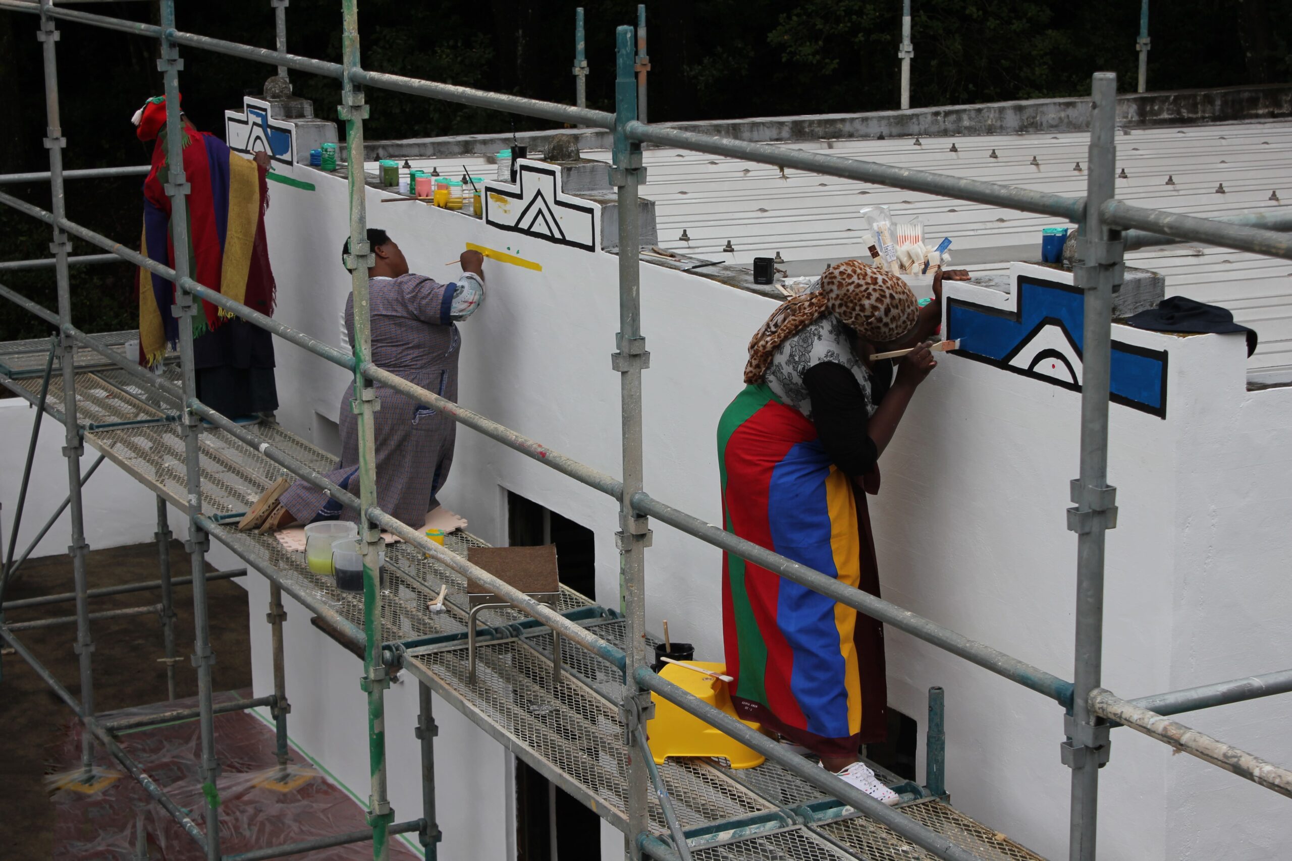 1995年にこの家屋を復元した際、壁絵は現地から招聘した4人の絵師によって、約2か月をかけて描かれました。それから約20年が経過し、紫外線や風雨により外壁面の色褪せが進み、劣化が目立つようになりました。そこで2016年9月に、南アフリカから4名の絵師を招き、約2か月をかけて壁画の塗り直し作業を行いました。