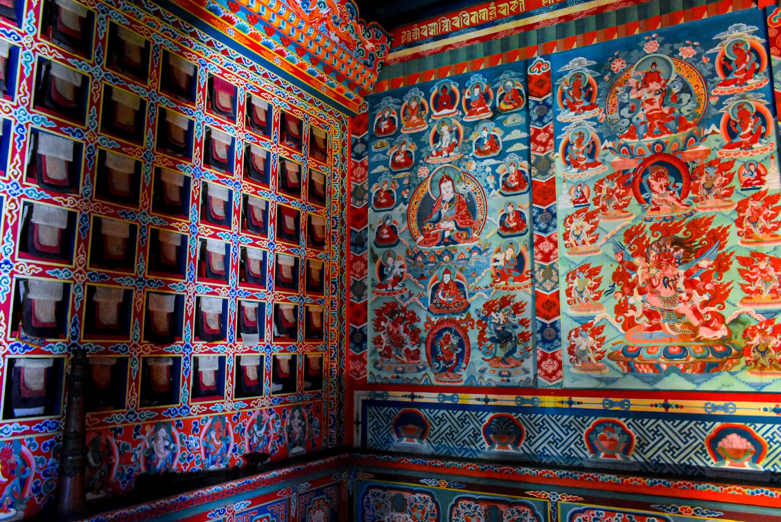 1階の左壁には阿弥陀如来や十一面観音など顕教の仏像が描かれ、右壁にはチベット仏教特有の男女合体仏が表現されています。また、天井には4枚のマンダラが描かれています。