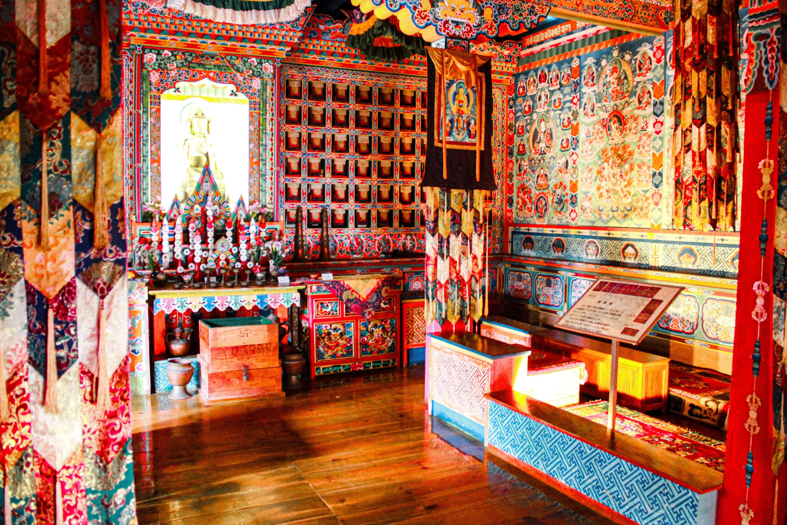 本堂の1階と2階を埋め尽くす極彩色のマンダラと仏画は、現地から招聘した絵師10名によるもので、1年以上かけて復元されました。これらの絵は悟りを表現する手段として描かれており、天然絵具を使用した美しい作品は、芸術的にも高い評価を受けています。