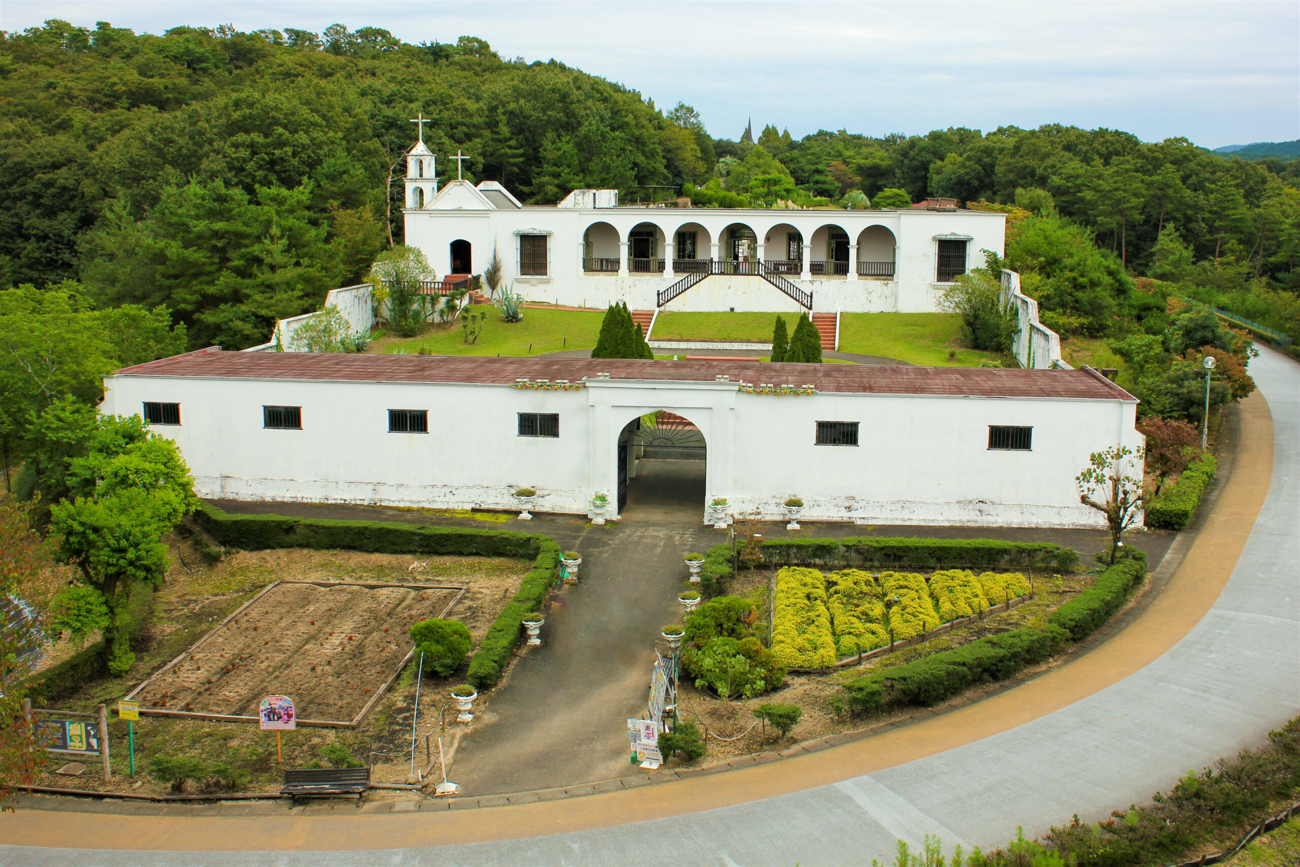 リトルワールドに復元された十字架は、「ペルー 大農園領主の家」を背景に、周遊路の右手に立っています。