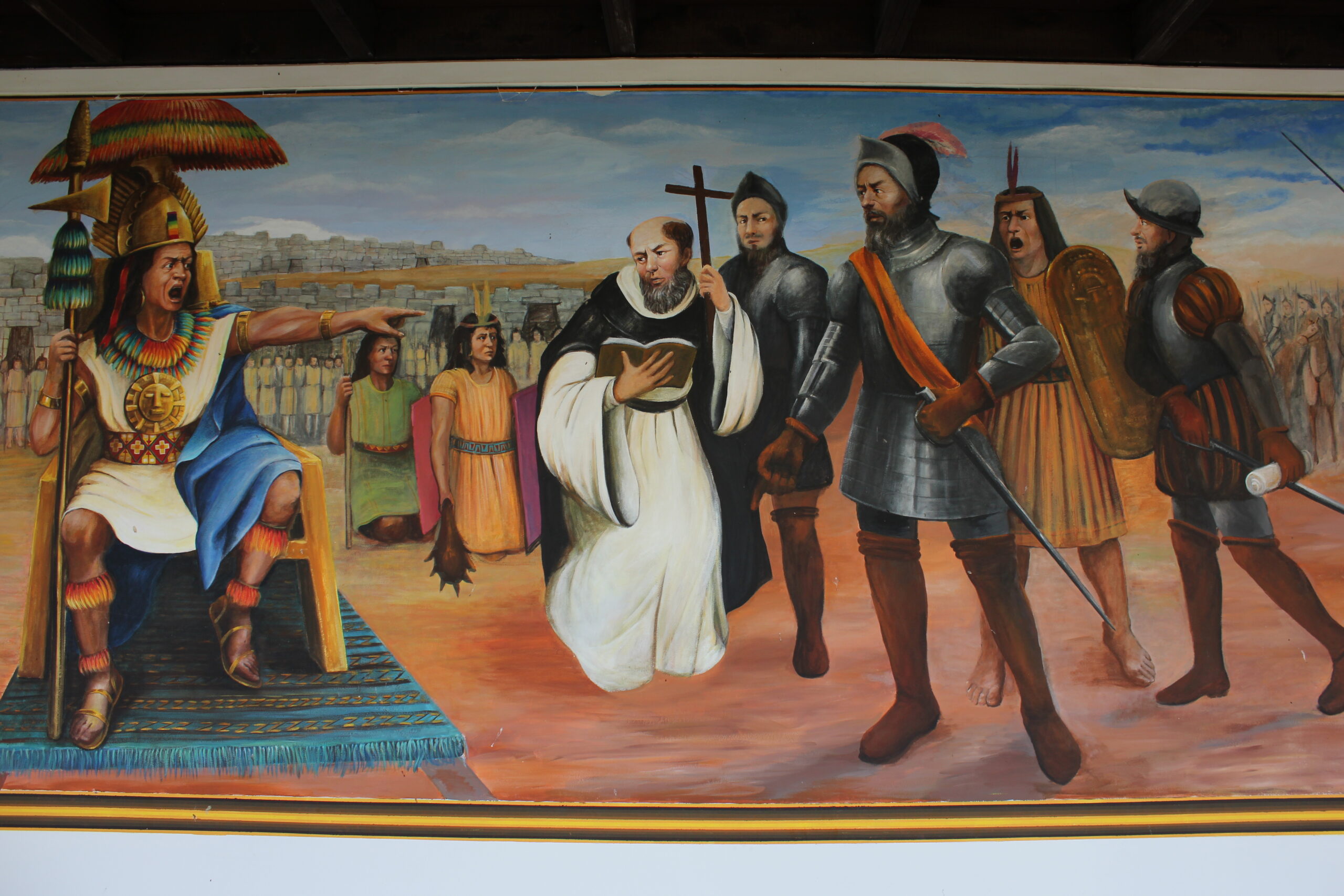 礼拝堂と倉庫棟には、ペルー人画家で修復師であるハイメ・ロサン夫妻の手による壁画が半年にわたって描かれました。礼拝堂には、現地「カキ」の壁画「イエスの誕生」「最後の晩餐」を、同じ“テンペラ”という技法(顔料に卵を混ぜて描く)を用いて忠実に再現しています。倉庫棟には、「インカ帝国の滅亡」「アシエンダのくらし」というテーマで描いています。