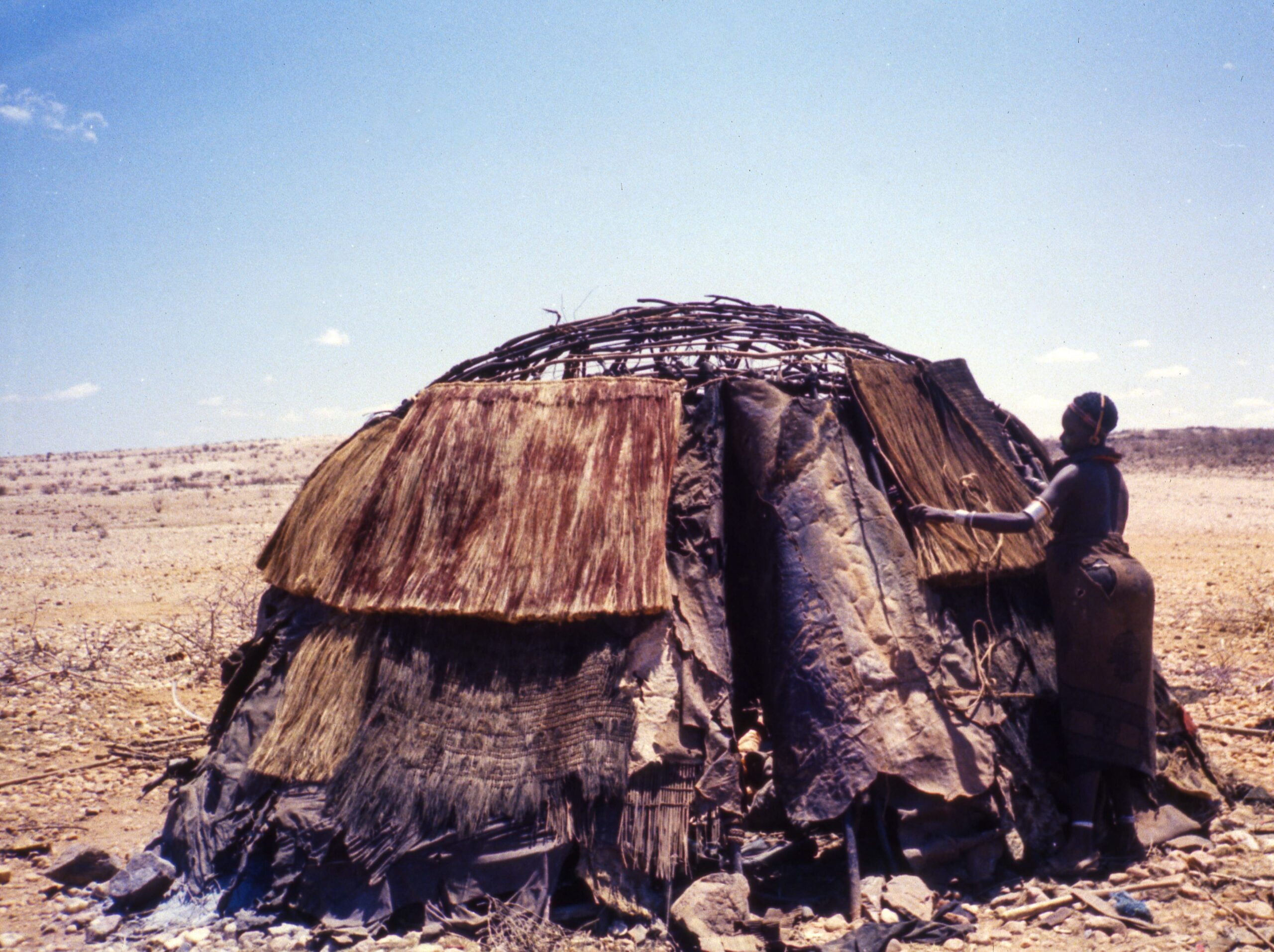 レンディーレは、ケニア北部の砂漠地帯でラクダやヤギを遊牧する人々です。彼らのテントは、しなやかな木で組んだドーム状の骨組みに、サイザル麻で編んだむしろを被せたものです。入口を入ると土間があり、その奥には皮を敷いた居間が広がっています。居間は向かって右が男、左が女の場として使われます。