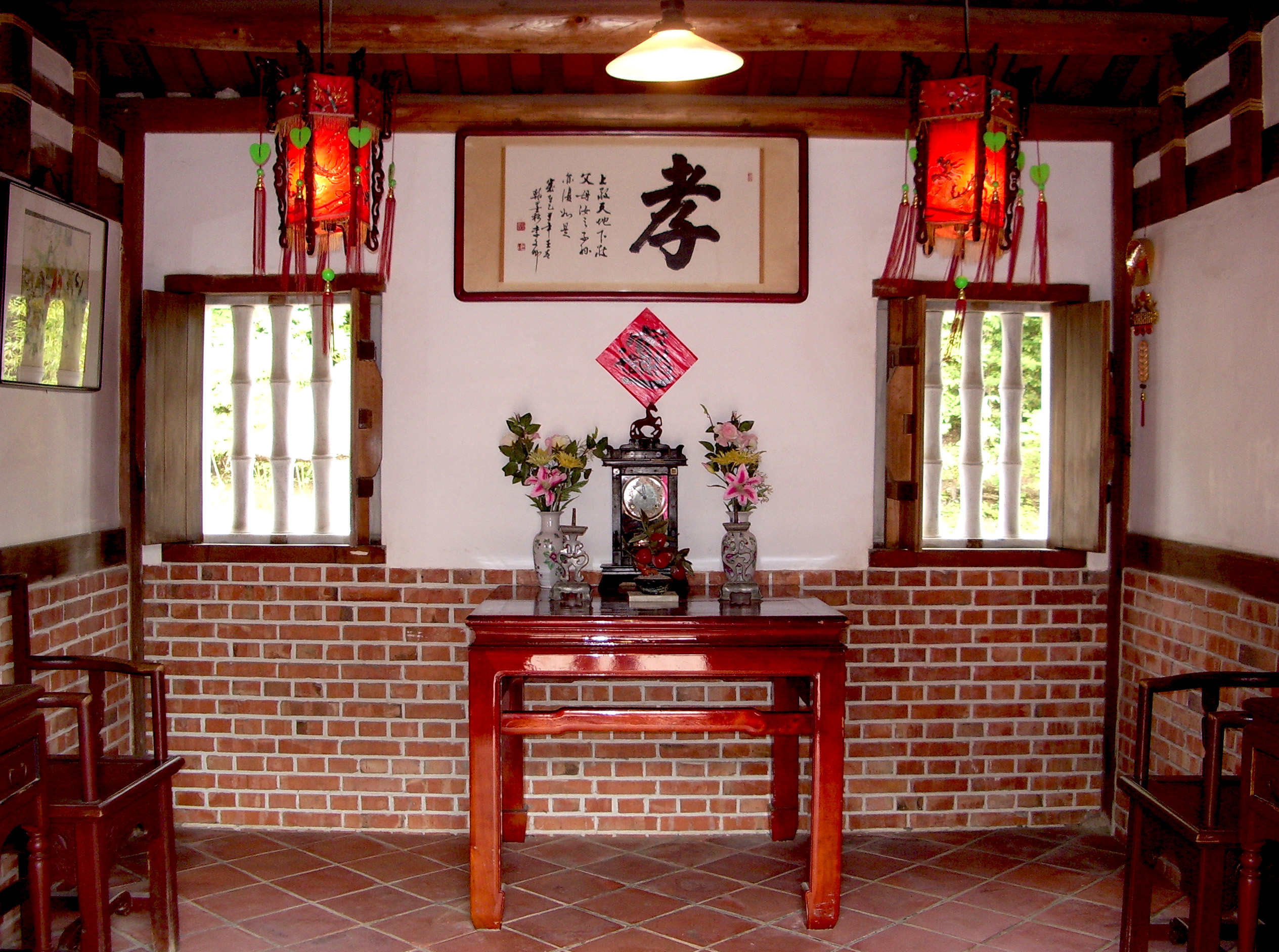 正庁では、祖先や道教の神々を祀るほか、祖先の命日や神々の誕生日には供物をささげて家族全員でおまつりをします。また、大切な客を招き入れたり、客間や祝宴の会場、冠婚葬祭の儀式をおこなう場としても使われます。