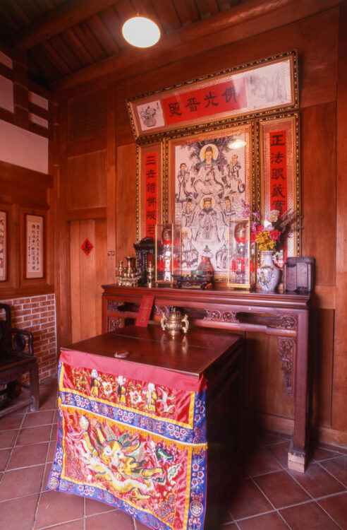 正庁では、祖先や道教の神々を祀るほか、祖先の命日や神々の誕生日には供物をささげて家族全員でおまつりをします。また、大切な客を招き入れたり、客間や祝宴の会場、冠婚葬祭の儀式をおこなう場としても使われます。