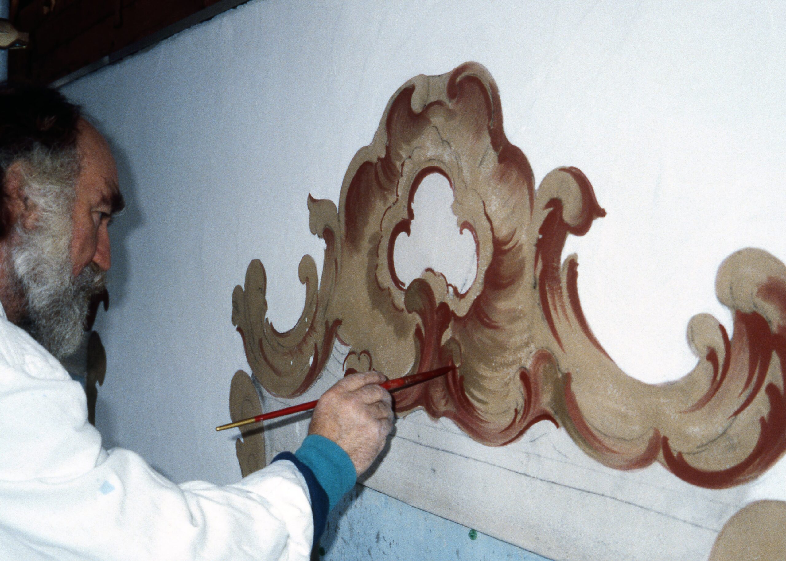 復元に携わったゲルハルト・フリードリッヒ・エスター氏は、そんな数少ない画家のひとり。彼の作品や、リトルワールドでの復元の様子は、ガストホフバイエルンの2階地域展示室で、映像を通して見ることができます。